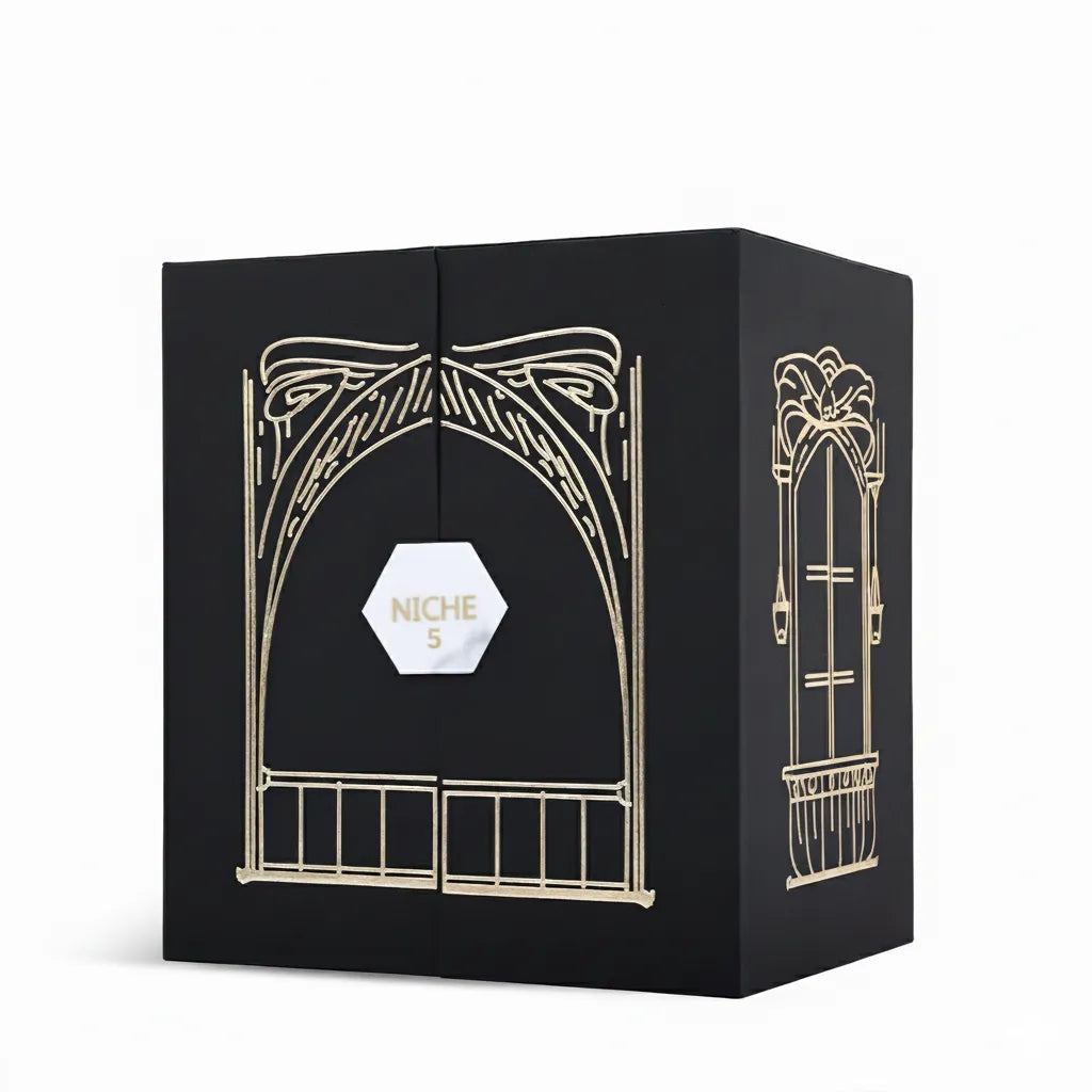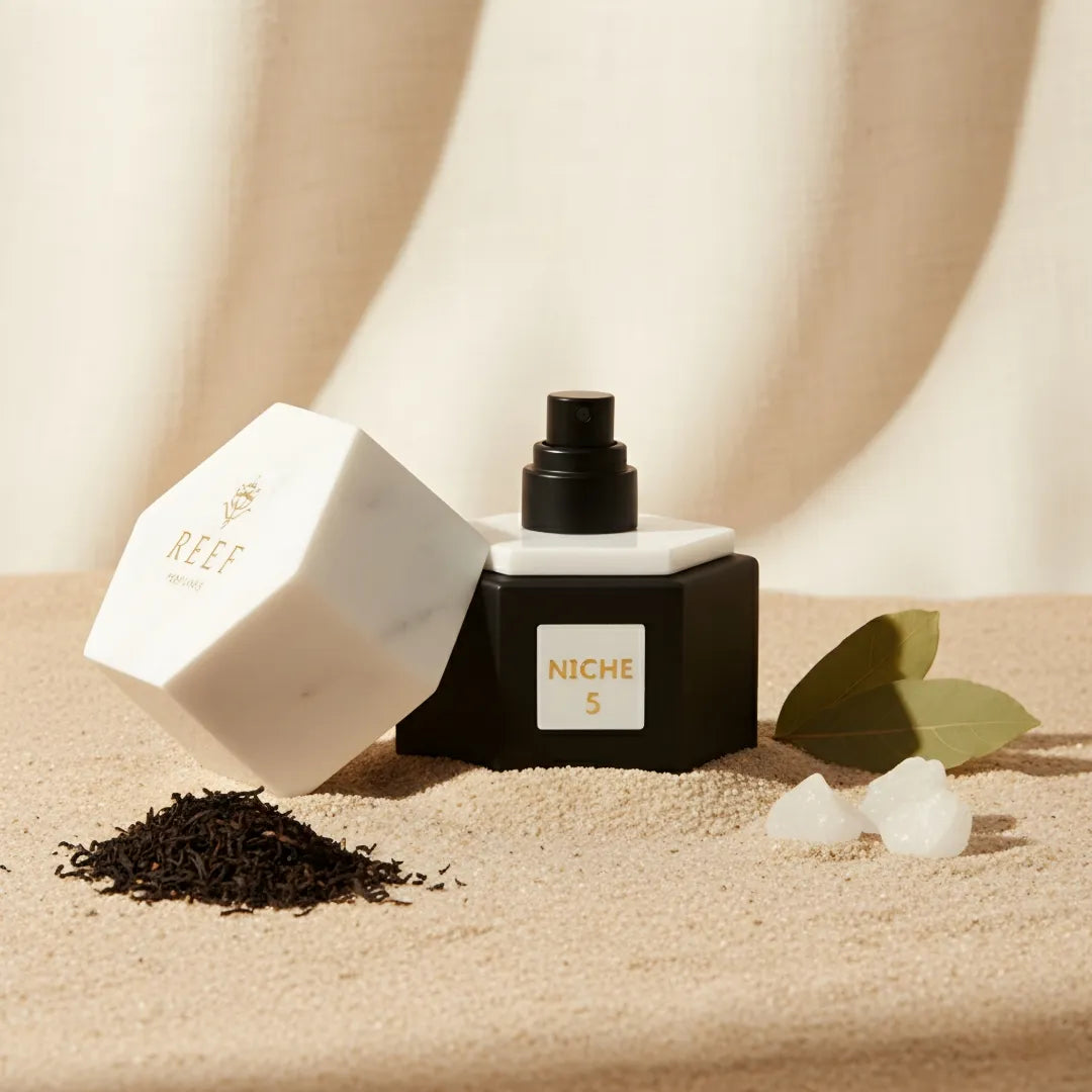 La piramide olfattiva inizia con il profumo intenso del Tè Nero, che aggiunge un tocco di calore e tranquillità, prima di armonizzarsi con il ricco Patchouli, donando profondità e fascino. Infine, la fragranza poggia su una morbida base muschiata, che le conferisce una tenuta vellutata e un tocco sofisticato e duraturo. Niche 5 è pensato per chi ama le fragranze uniche e accattivanti: non è solo un profumo, ma un'esperienza che esprime la propria personalità con sicurezza ed eleganza.