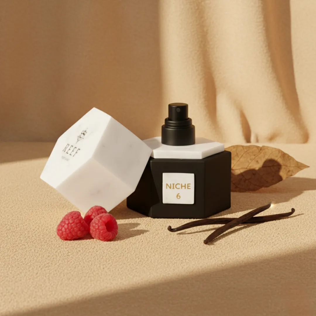 La piramide olfattiva di Niche 6 è un accordo caldo e speziato. Si apre con la nota inebriante di Bacche Selvatiche e Lampone, che dona un'immediata sensazione di dolcezza. Il cuore è dominato dal Tabacco, che aggiunge una profondità scura e avvolgente. Infine, il fondo si sigilla con la Vaniglia, che conferisce una dolcezza cremosa e un'impronta olfattiva che non svanisce.